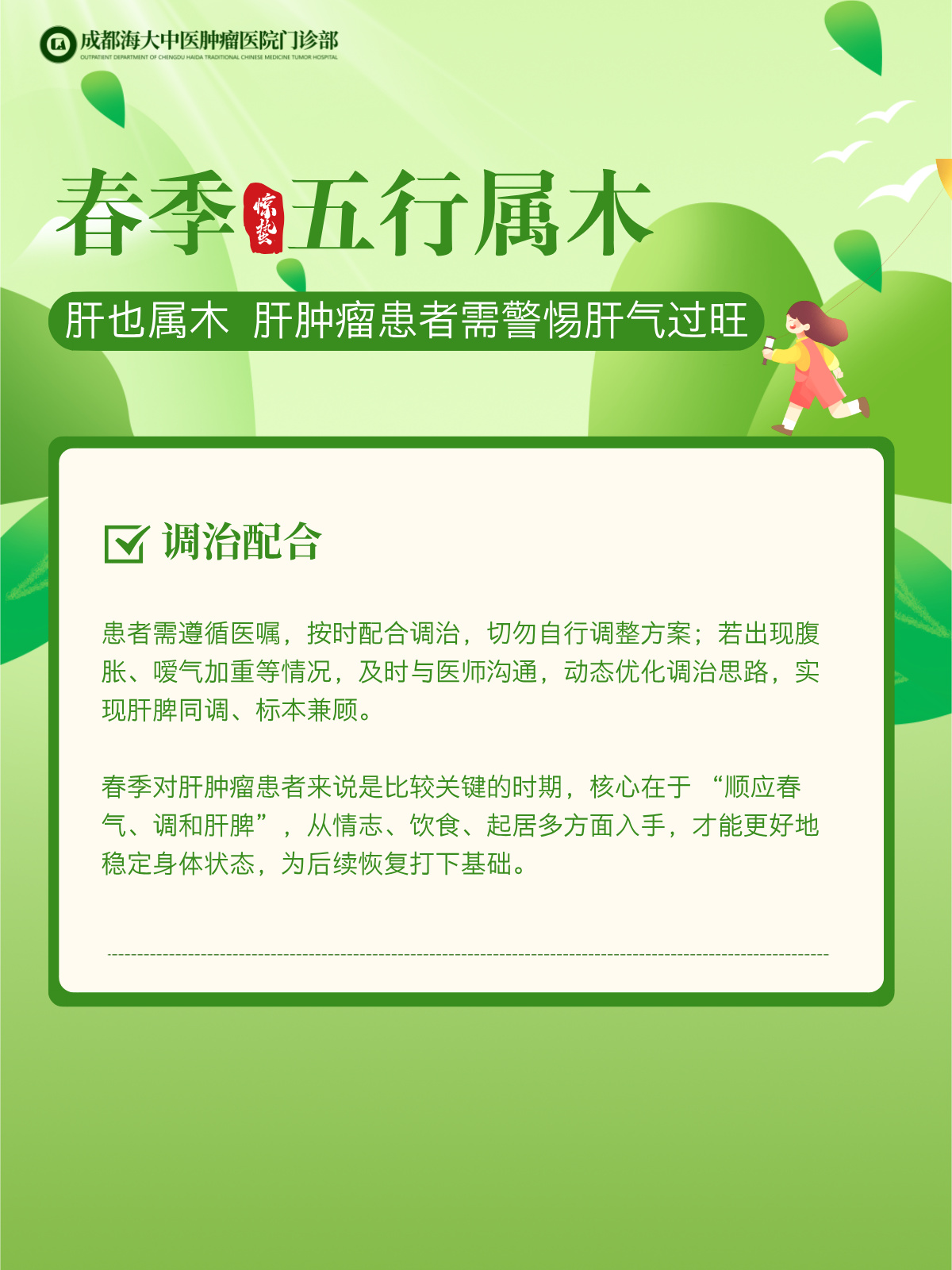 成都海大中医肿瘤医院门诊部蒲忠勇主任指出: “春属木,肝亦属木”,春季阳气升发,肝气随之旺盛,这种 “同气相求” 的特性,对肝肿瘤患者而言,既是顺势调护的好时机,也需警惕肝气过旺、木旺乘土带来的身体负担。结合患者体质与病情特点,春季调护需重点关注三个方面,具体内容请看图。